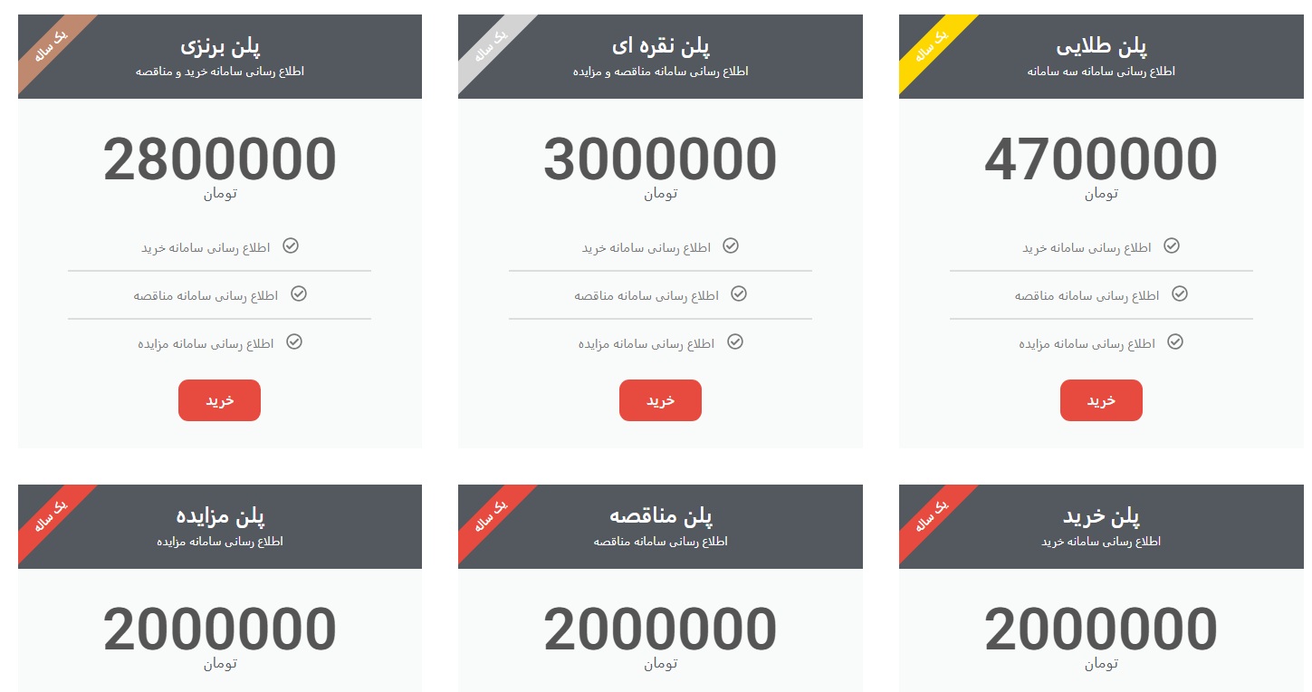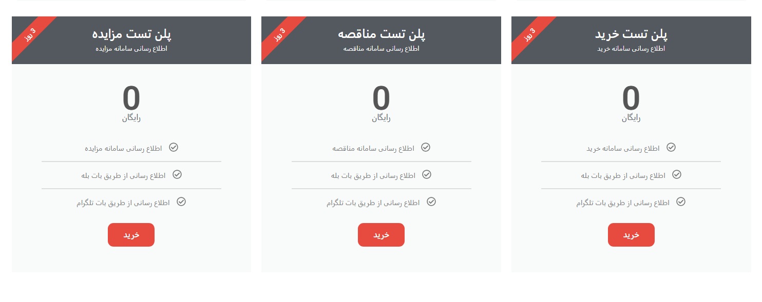 نکته : جهت تست سامانه اطلاع رسانی ستاد می توانید اقدام به تهیه پلن های تست نمائید ( پلن تست خرید ، پلن تست مناقصه ، پلن تست مزایده ) همچنین می توانید هر سه پلن تست را تهیه نمائید لازم به ذکر می باشد پلن های تست محدودیت زمانی 3 روزه دارند.