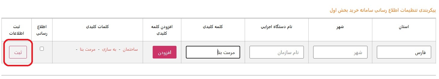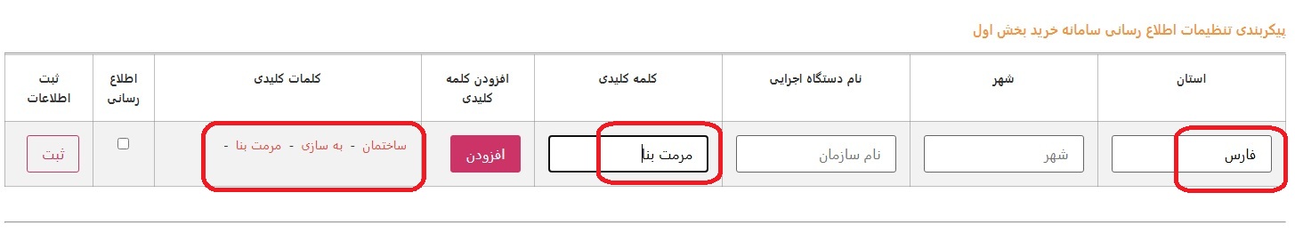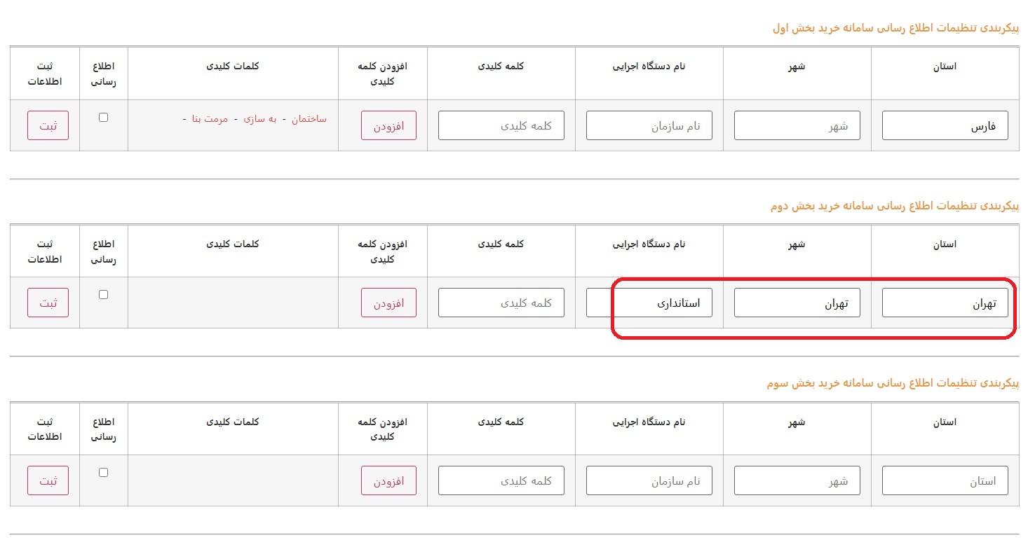 به عنوان مثال یک بخش برای اطلاع رسانی معاملاتی که مربوط به استان فارس و کلمات کلیدی ساختمان ، به سازی و مرمت بنا باشد یک بخش مربوط به اطلاع رسانی فقط شهر تهران و دستگاه اجرایی استانداری باشد که باید در قسمت شهر نام شهر را تهران و نام دستگاه اجرایی را استانداری وارد نمائید که با این تنظیمات تمامی معاملاتی که مربود به استانداری تهران می باشد برای شما اطلاع رسانی می شود