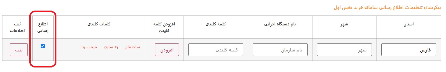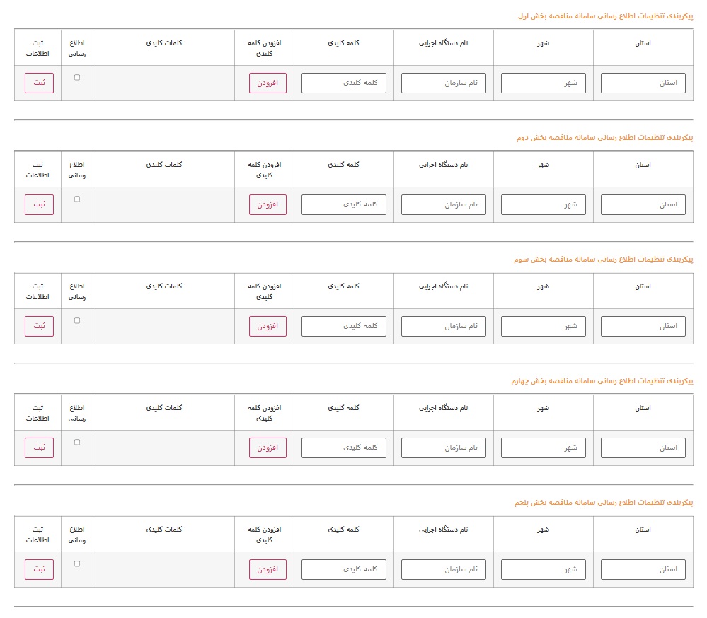 نکته : در صورتی که در هر بخش تظیمات بیشتری وارد نمائید تنظیمات اطلاع رسانی شما محدود تر و سفارشی تر برای شما اطلاع رسانی میگردد به عنوان مثال اگر فقط قسمت استان را وارد نمائیئ تمامی معاملات مربوط به کل استان برای شما ارسال می شود ولی اگر قسمت شهر را نیز وارد نمائید معاملات شما محدود به شهر آن استان می شود و اگر قسمت نام دستگاه اجرایی را نیز وارد نمائید فقط معاملات مربوط به آن شهر و فقط آن دستگاه اجرایی برای شما اطلاع رسانی می شود و همچنین اگر کلامت کلیدی نیز وارد نمائید اطلاع رسانی شاما محدود به آن شهر و آن دستگاه اجرایی و فقط معاملاتی که مربوط به آن کلامت کلیدی باشند برای شما اطلاع رسانی می شوند.